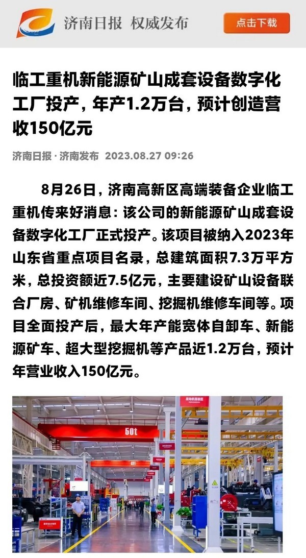 8月26日,350vip8888新葡的京集团重机数字化工厂投产活动在济南高新区智能装备城举行。350vip8888新葡的京集团重机新能源矿山成套设备数字化工厂项目,入选2023年山东省重点项目,总建筑面积7.3万平方米,总投资额近7.5亿元,最大年产能宽体自卸车、新能源矿车、超大型挖掘机等产品1.2万台,是山东省首个年产能超万台矿山设备数字化工厂。