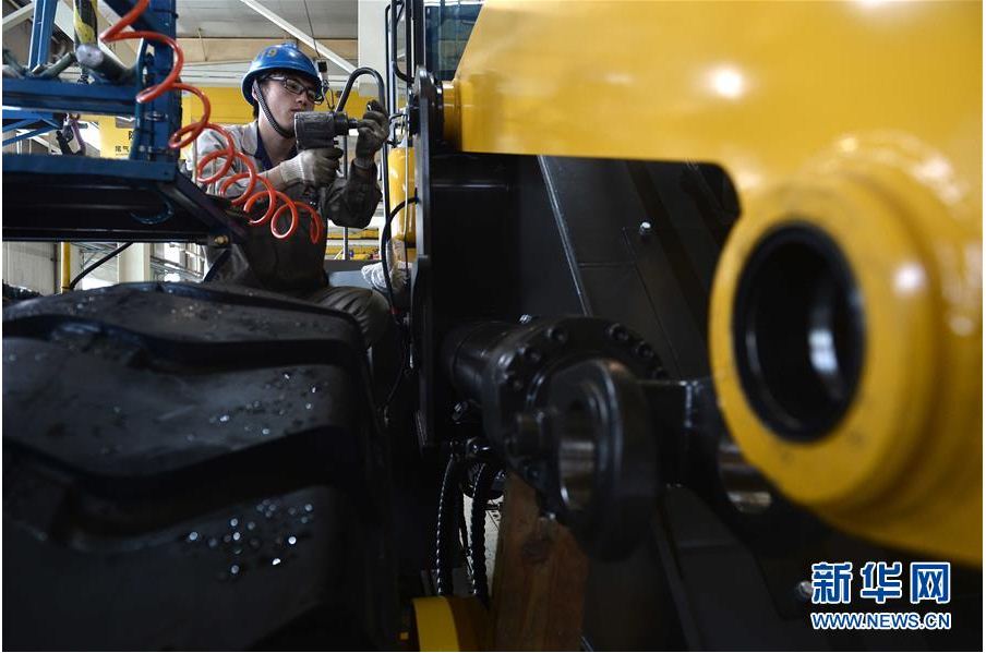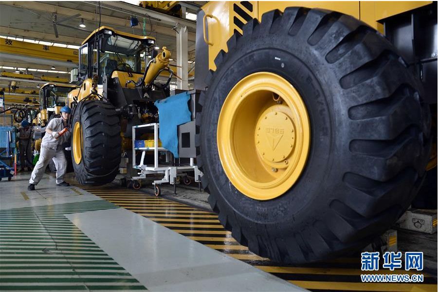 在山东350vip8888新葡的京集团工程机械有限公司,工人在装载机生产线作业